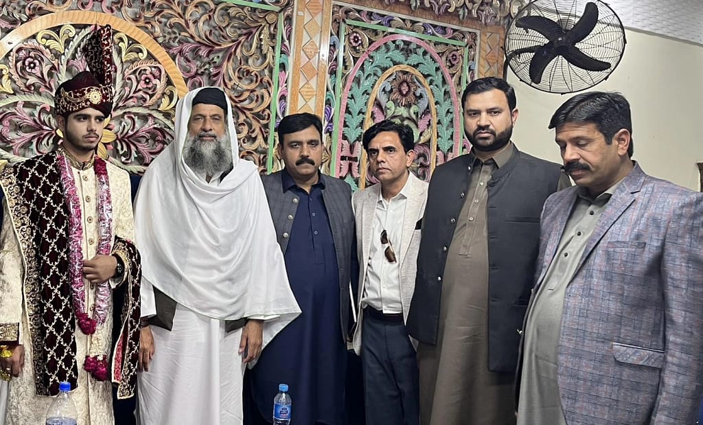 Hazrat Faqir Ghulam Hasnain Qadri, commonly known as Sain Sarkar, the custodian of Khanqah Bari Shah Latif Dargah-e-Latifiya Hazrat Imam Bari Sarkar Chak Malook, attended the wedding ceremony of Muhammad Zain Rauf and Muhammad Mushtaq Rauf in Pasrur and offered a special prayer.